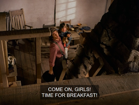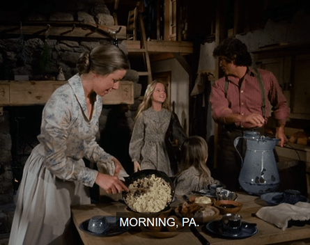 In the Little House, Ma is cooking and trying to keep Carrie off the ladder again. “Mary, Laura, come to breakfast!” she calls out Britishly (we didn’t have to wait long this time).