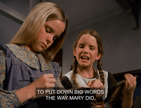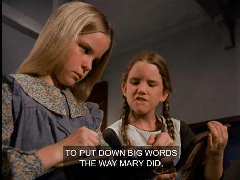 Now, why is it Mary can read but Laura can’t? We discussed this question at some length in my house. I suppose if you go by the Ingallses’ real-life timeline it makes more sense, since they were on the road for years between their original departure from Wisconsin and ultimate arrival in Walnut Grove.
