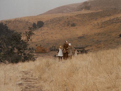 Cut to a shot of Caroline and all three girls climbing a hill with the Little House in the distance behind them.