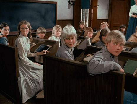 Then she surprises us by telling Pa she loves school. Things must have improved as the day wore on, because what we just saw of it resembled a prison just before the riot starts.