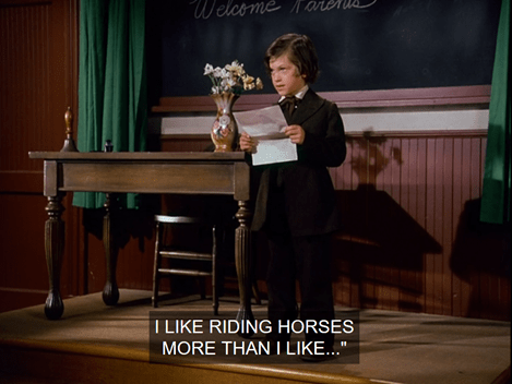 Anyways, Miss Beadle formally welcomes them to the class. The mean, lunkheaded kids just mutter under their breaths, so Beadle forces them to loudly greet the girls in unison. (Nellie refuses.) Seems like a pretty awful classroom dynamic.
