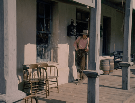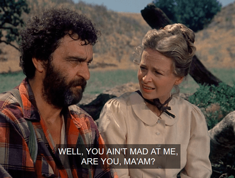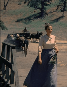 Charles lugs the goods from his wagon into the Mercantile; apparently his trip was on behalf of the Olesons. An attractive middle-aged woman, whom Charles addresses as Mrs. Snider, exits the store . . . and is immediately spat upon by Mr. Edwards, who just wasn’t looking. (For some reason, though, they don’t show the spit on her dress.)