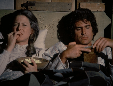 Then it happens: We get the first popcorn scene! Yes, as we will many a time, we find Charles and Caroline sitting up in bed, eating popcorn and gossiping. Charles is reading a book; we debated whether it would be Mark Twain or the Farmer’s Almanac, but Twain’s first book didn’t come out till 1873, so it’s probably the latter.