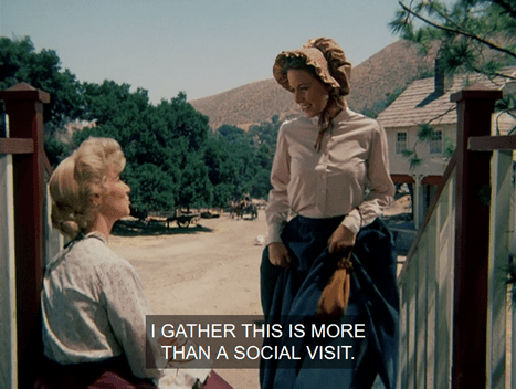 Anyways, Laura also stays behind to stare at Johnny, but speaking of butts, Beadle essentially tells her not let the door hit hers on the way out. Once outside, though, Laura tells Mary she’s forgotten something and must go back. Mary calls her a “flutterbudget” – apparently a real term of endearment in the Ingalls house.