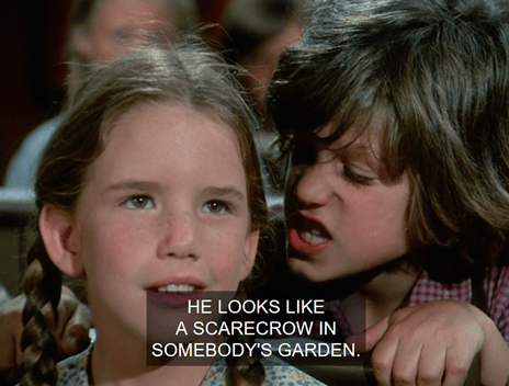 Willie whispers to Laura that the newcomer looks like a scarecrow. He’s not wrong, though if you can believe what the Internet says about people’s heights, Mitch Vogel was only five-foot-eight. I guess when everyone else in your class is four-foot-two it’s easy to seem tall.