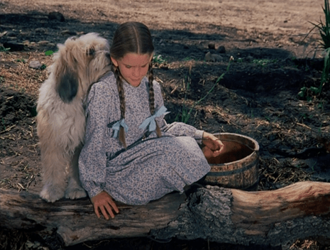 Laura says she wants to fetch the water from the creek even though it’s Mary’s turn. But when she gets there, she just sits by the water chewing her lip while Jack licks the back of her head. (Maybe she’s got mush on it?)