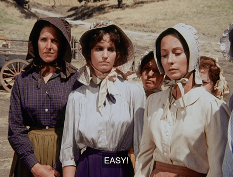 Enter Ma, who’s shocked by this rudeness. She wants to determine whose fault the argument is . . . in my personal view a losing strategy for any parent to take. Some disagree, I know. Karen Grassle decides to become Canadian for this scene, saying, “Laura, I want you to hear your sister oot!” Fortunately Laura runs off before we get into any she-said/she-said bullshit.