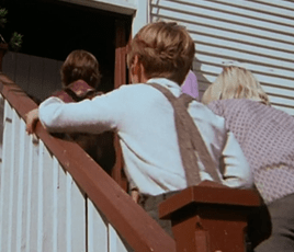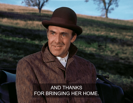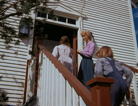 The matter of the horse gets even more complicated, because when they arrive, Miss Beadle pulls the reins and says “Whoa, Pat!” You’ll recall that Pat (or possibly “Pet”) was the name of the Ingallses’ horse that brought them up from Kansas and then got traded away in “A Harvest of Friends.” Was this such a common name for horses? Or is it really supposed to be the same animal? I guess it’s quite possible Miss Beadle eventually bought him. But if it is, HE’S BUNNY’S FATHER!