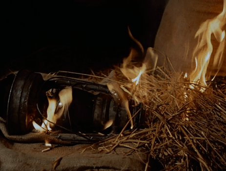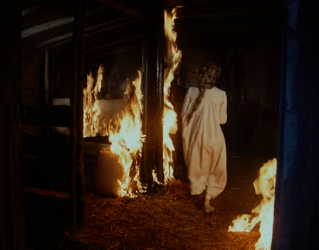 She grabs Pa’s raccoon-murdering pitchfork and knocks the lantern away, but that only succeeds in lighting another part of the barn on fire.