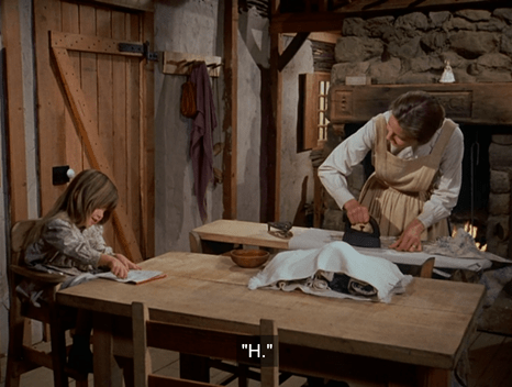 Then we get a hilarious little scene back at the house. Ma is ironing and trying to teach Carrie her letters.