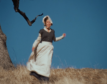 Caroline (who’s wearing her floppy bonnet again) runs through a field and finds Mary sitting under a tree in dejection. Mary sees her and rises . . . and then suddenly they’re both running toward each other.