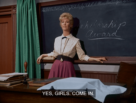 The girls arrive late, and find Miss Beadle posed (somewhat provocatively) at the chalkboard.