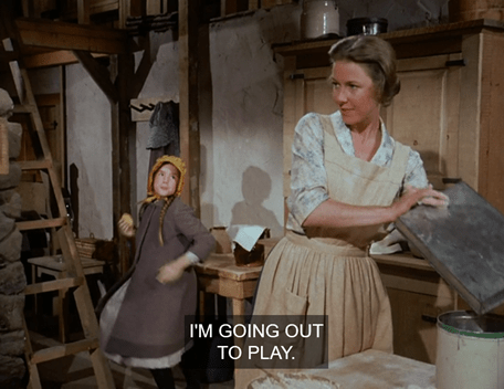 This is actually the start of a montage of Mary studying and doing her chores, which include fetching water from the creek and muckin’ the auld byre.
