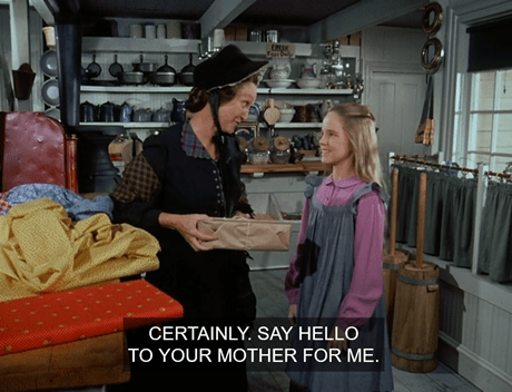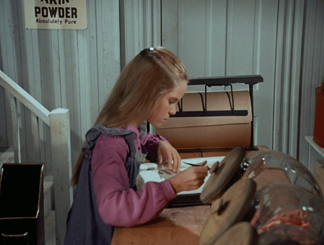 After three weeks, Nels pays Mary her pittance of $1.50 ($30). Where Mrs. Oleson is while all this is going on, we never find out, but presumably she’s the one responsible for this skimpy compensation package. (“She probably calculates all the time Mary spends reading and deducts it from her pay,” said Luba.)