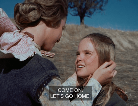 Anyways, Laura says Pa’ll be gone for three weeks. Ma and the kids wave goodbye as the wagon departs. The girls are in their cold-weather coats again (though we can see flowers on the bushes as the men drive away – wobble wobble).