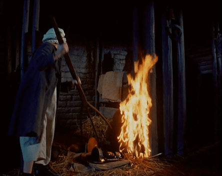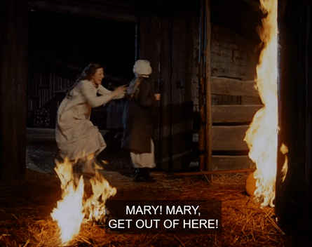 MA [spinning around, ferociously]: HOW MANY TIMES HAVE I TOLD YOU NOT TO LIGHT MATCHES OR LANTERNS IN THE BARN!