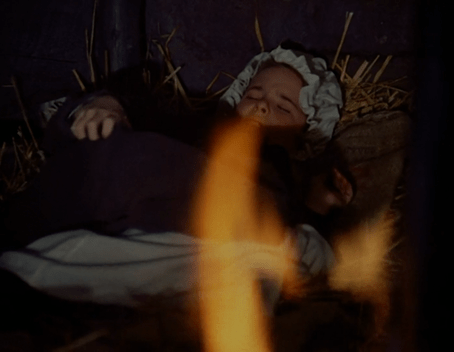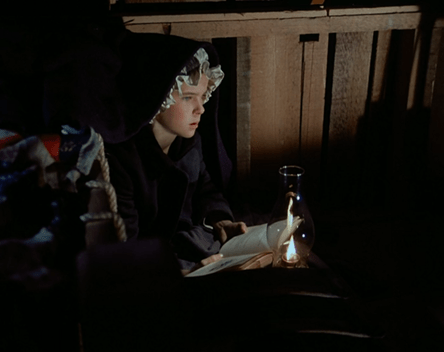 But she still can’t sleep, and in the night she takes her book, lantern and winter coat and creeps out to read in the barn. She begins yawning immediately, though. Not a good sign, that. (“I wouldn’t give her an Emmy for her ‘tired’ acting,” said Luba.)