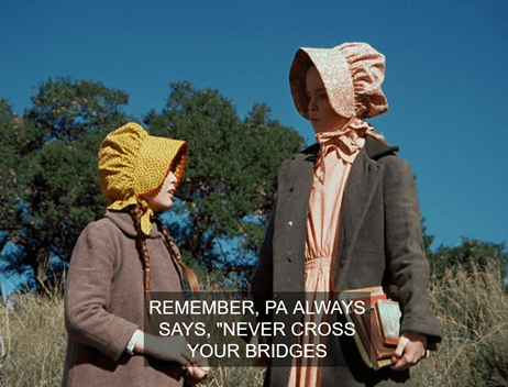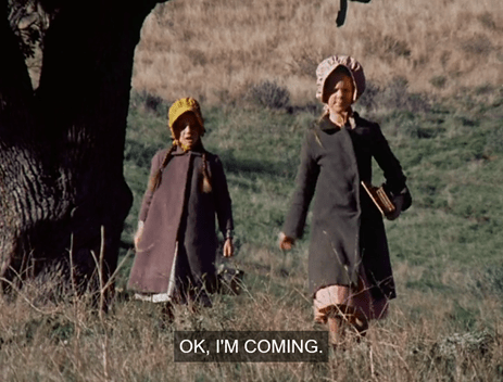 The girls come down the Shady Hill on their way home. Mary is reading as she walks, which takes me back to my own youth. Laura says she can’t abide history, as “it’s all about dead people – yuck.” And we have seen previously that she’s squeamish about death to the point where she won’t even sing about a dead goose.