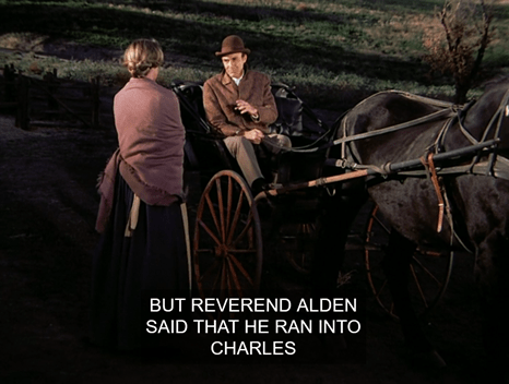 Ma says she was getting worried and thanks Nels for bringing Mary home. Smiling warmly, Nels praises Mary’s abilities, then says by the way did you hear Rev. Alden ran into Charles in New Ulm? Caroline must be getting sick of this story.