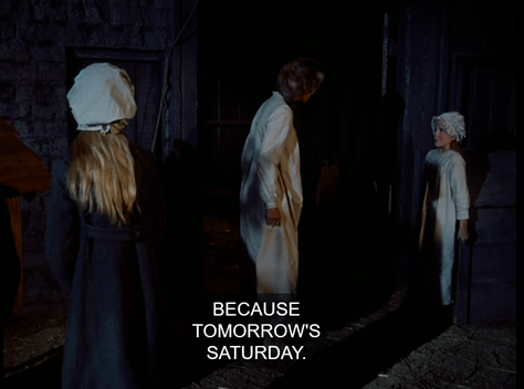 The harpsichord-thing plays You Know What again. You almost wish they’d throw in “Old Dan Tucker” at this point just for variety. (And in fact Luba did sing it during this viewing – several times.)