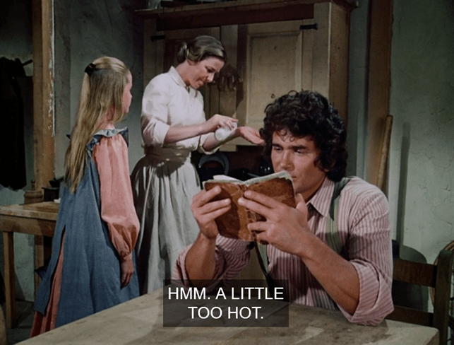 To which Ma, sounding British-ish, replies that’s hardly ladylike, and Pa says shut up and eat your supper.