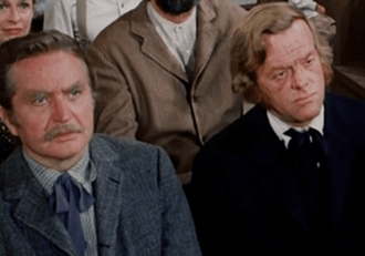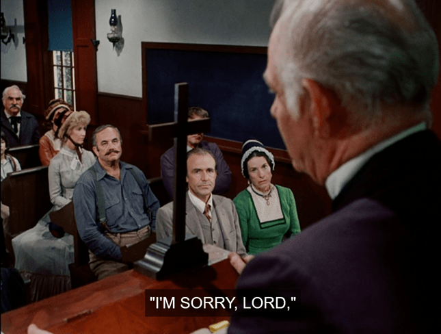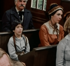 We go to commercial, and when we return, Rev. Alden is preaching in church. It clearly isn’t Freddie’s funeral, since nobody’s wearing mourning clothes and the Ingallses are sitting towards the back, but Alden’s remarks still seem aimed at comforting a community reeling from a loss.