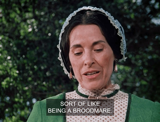 Anyways, Caroline snuggles up to Charles and notes he’s been referring to the impending arrival as a boy. She talks in a whispery over-enunciated voice here that got us doing impressions of Mrs. Garrett from Deadwood