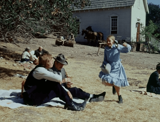 Laura happily runs back to her family and asks Pa to play some games with her. He and the girls run around for a while to the accompaniment of a waltz arrangement of “Bum-Bum-Ba-Dum.” Eventually they collapse, exhausted, in a field of big green plants.