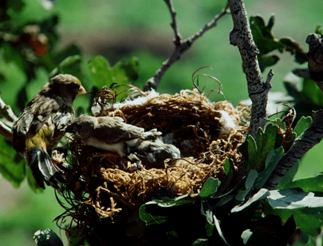 Then we see the birds in the nest have hatched and grown to full size, WHICH INDICATES THE PASSAGE OF TIME.