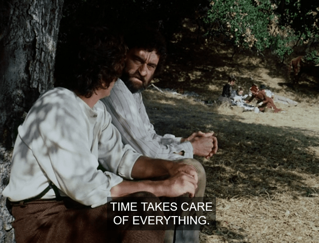 Mr. Edwards tells him not to worry, because “time takes care of everything.” I don’t know what he’s talking about; he was so depressed about losing his family that he got drunk and ransacked a saloon years later.