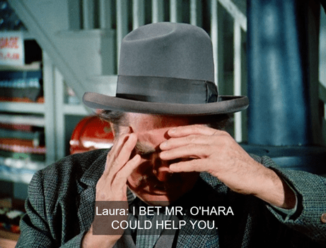 “I bet Mr. O’Hara could help you,” says a weird girlish voice out of nowhere. It’s Laura, of course, but she’s so heavily overdubbed she sounds more like the psychopathic doll Talky Tina in that episode of The Twilight Zone.