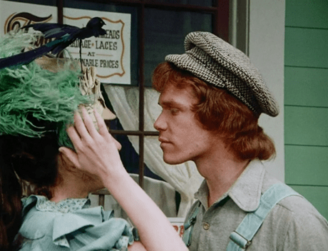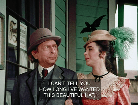 Cut back to Johnny and Mimi in the street. He’s bought her the hideous hat. She pecks him on the cheek and departs.
