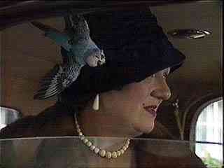 Miss Mimi says she covets a truly grotesque hat decorated with green ostrich plumes and a large dead bluebird. (Dagny pointed out similarities to a Mapp and Lucia storyline where Mrs. Wyse sits on and kills her pet budgerigar, “Blue Birdie,” then has it turned into a brooch, which she wears to its seance.)