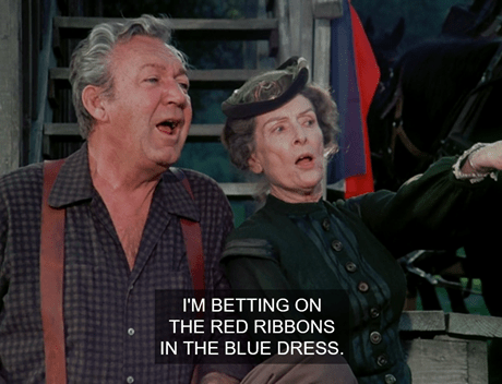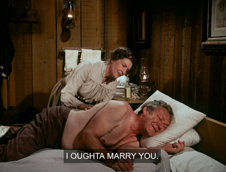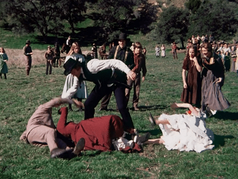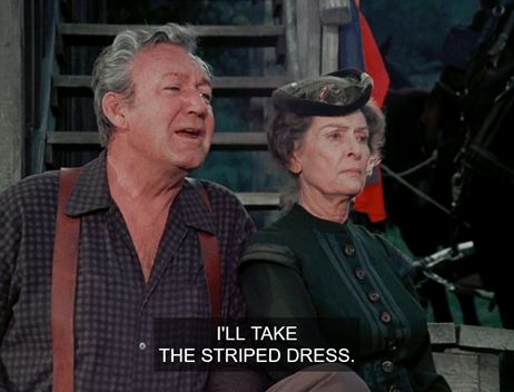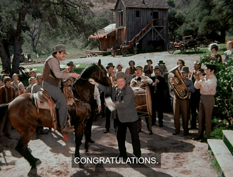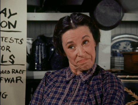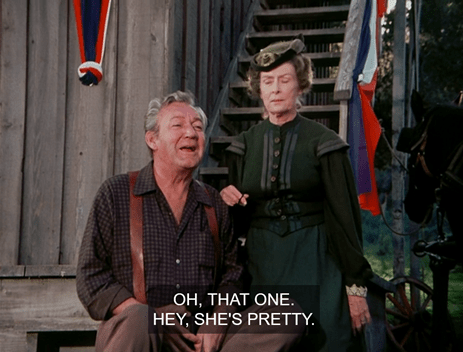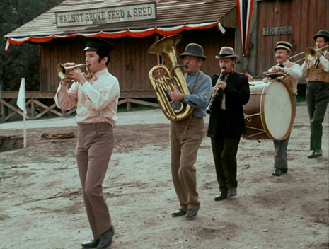 When we come back, the band is still marching and playing. Seriously, there’s a lot of fucking marching-band music in this one. The only thing that makes it redeemable is that every time she’s in the shot with the musicians, Katherine MacGregor covers her ears.
