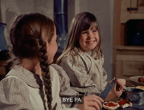 Pa heads out the door to work. The three girls all say, “Bye, Pa!” and then Carrie looks to her sisters for approval.