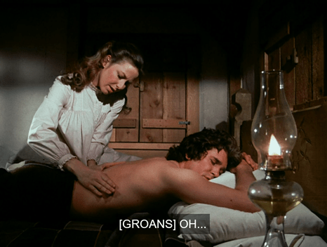 Later that night, Caroline rubs an aching Charles down with liniment, rubbing alcohol, mineral oil, or the like.