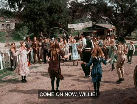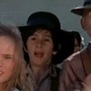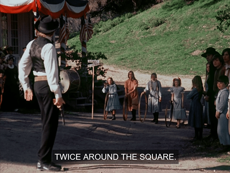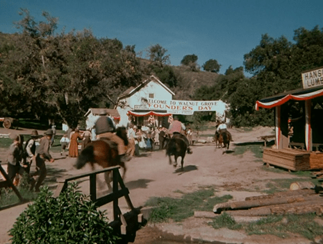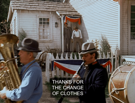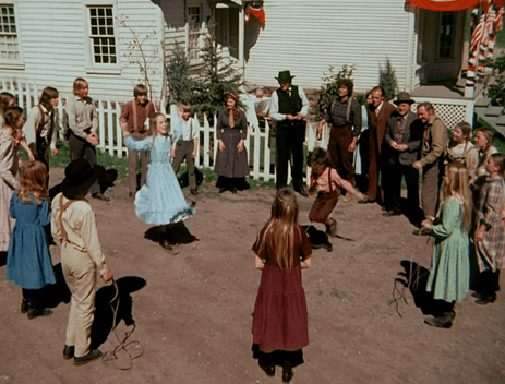 Pa and Laura hug fondly. Then we see the band marching through again; the Chonkies come round the corner with the Ingallses’ wagon; and the party generally breaks up.