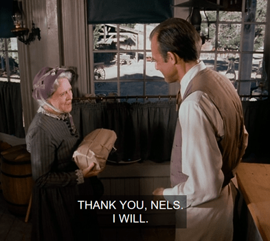 Nellie begs Mrs. Oleson to join as well, and Nels gives the latter some of the same guilt trip she laid on him. (Nellie giggles at this – heh.)
