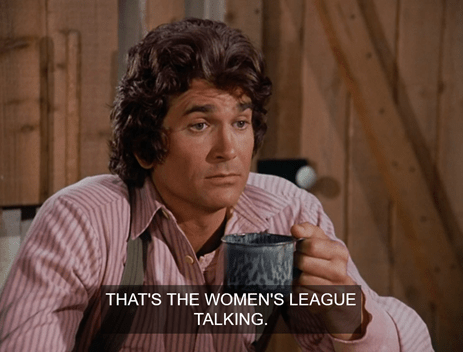 Pa’s smug response is “That’s the Women’s League talking.” Like Johnny Johnson before him, he looks to Laura and Mary for endorsement of his sexist comment.