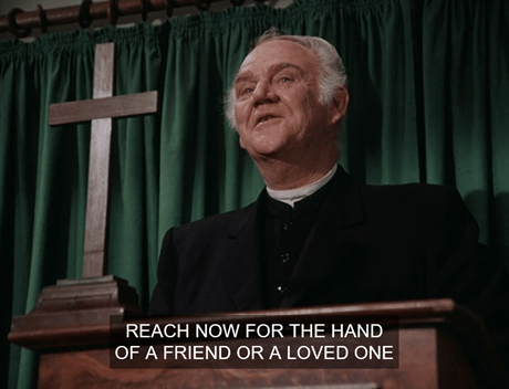 In church, Reverend Alden makes the little “joke” all ministers do on holidays about how he wishes everybody would show up the rest of the year.