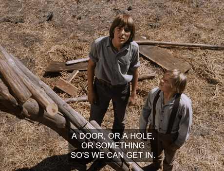 The next scene, I’m sorry to say, falls into the category of Jokes That Don’t Quite Work. Mr. Edwards is building a treehouse for the Sanderson kids, but John and Carl point out he’s forgotten to put in a door.