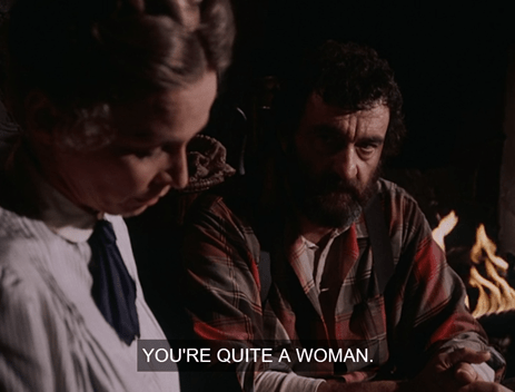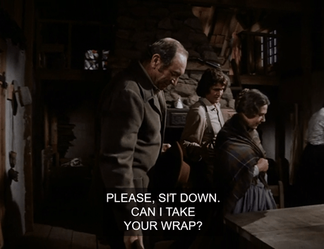 Meanwhile, at the Sanderson place, I guess, Grace Snider is putting the kids to bed whilst Mr. Edwards paces in front of the fire. He’s still wearing his funeral shirt, which seems unlikely, but I guess maybe he didn’t have time to go back to his hovel and grab his flannel.