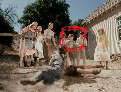 In the background, we see Willie Oleson and a similar-sized boy we’ve never seen before. They’re throwing gravel at a tree stump.
