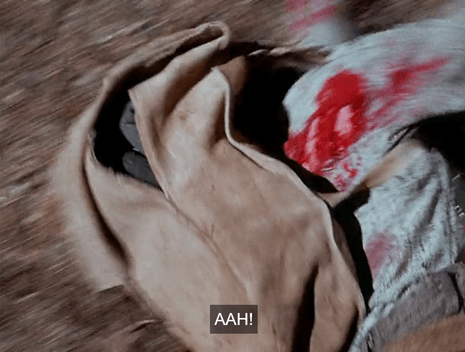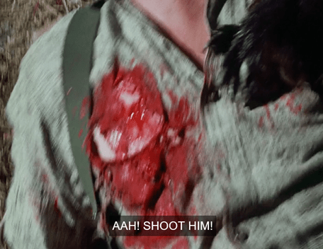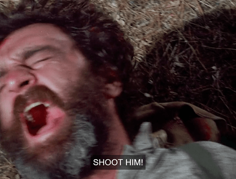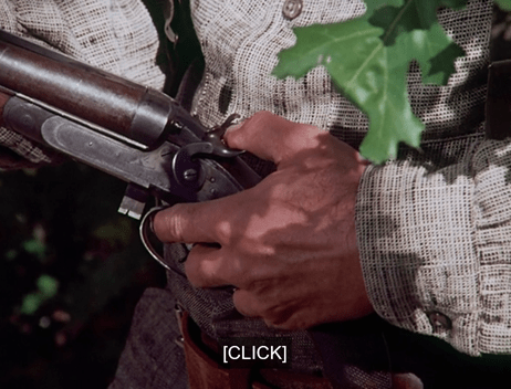 John takes aim, tries to shoot, but can’t, so he turns the gun to the ground and fires in frustration.