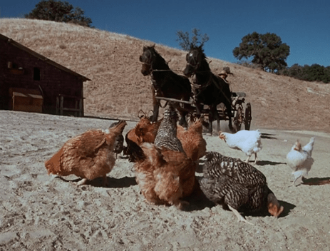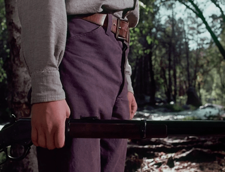 Then he turns around and we see he’s actually been test-shootin’ the gun. He and Charles are hanging out with a watery-eyed old codger who’s selling rifles out of a wagon, door to door I guess.