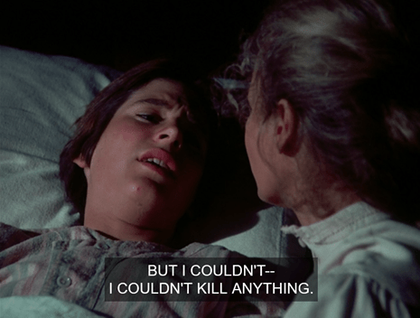 John says he just tried to shoot a deer, but couldn’t kill an animal. They don’t really go into it, but the theme of all the poetry John’s been reading is man communing with nature rather than considering himself superior to it and destroying it.
