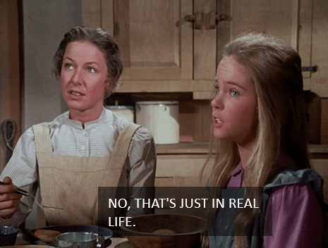 4. I recently found your blog and I’ve gotta say, it’s CRACKING ME UP! I was born and raised in the great state of South Dakota for the first 24 years of my life. We lived about 90 miles from where the Ingalls family settled in De Smet. In fact, my great grandparents settled only about 60 miles away from the Ingalls homestead. As a kid, there were a couple occasions when my grandpa would take us for a drove to his old family homestead and we would detour to the Ingalls homestead as well. I was lucky enough to tour their homestead a couple time and even bought a replica “Laura” bonnet. Anyway, that was the long way for me to say I’m a huge fan of Laura Ingalls Wilder, I have read all her books and I watched the show religiously after school everyday in the 80’s. In fact, if my brothers even thought about using the one and only TV we owned to watch something else, I would literally lose my shit! Lol