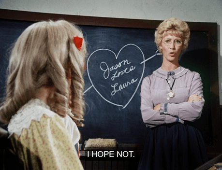 Mrs. Oleson says Nellie’s a clever girl and will find out Jason’s weakness eventually. As we’ve discussed before, Mrs. O is a proto-feminist of sorts, though it’s more on the Lady Bracknell manipulation-and-power-plays model than the barnstorming suffragette one.