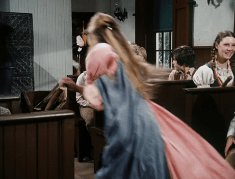 The kids continue to chuckle, and she screams “Quiet!” She demands whoever wrote the message on the board confess immediately, as Laura heaves with shame in the front row.