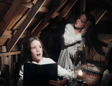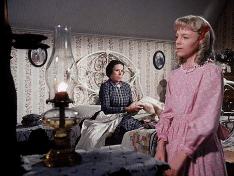 In the bedroom, Laura is a bit awed by Nellie’s material wealth, which includes fancy French dolls and the like.